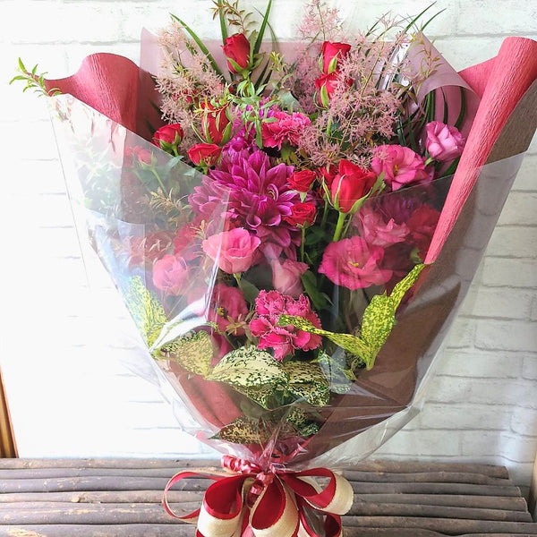 赤いバラをメインにレッド系統でまとめた「パルテール」のブーケ。おしゃれでボリュームたっぷり!結婚祝いや昇進祝い、還暦祝いなど、さまざまなシーンにおすすめ。