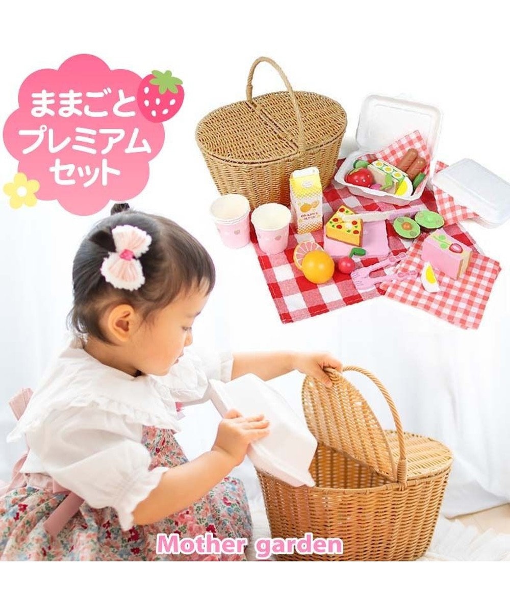 木でできた食材がなんともかわいらしいマザーガーデンのピクニックセット。お片付けが上手になりそうなバスケット付きです。かわいらしい絵本の中のような世界観に女の子も遊ぶ前からウキウキに。バスケットやクロスはいつか本当のピクニックでも使えそうなほどリアルです!